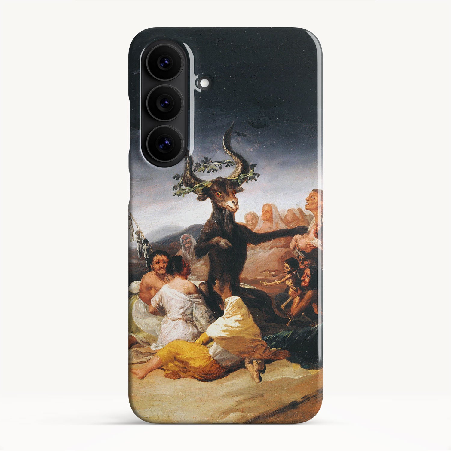 In the painting, Goya depicts a moonlit gathering of witches in a desolate landscape, engaged in an occult ritual and feeding infant souls to a goat-like figure with large horns.
